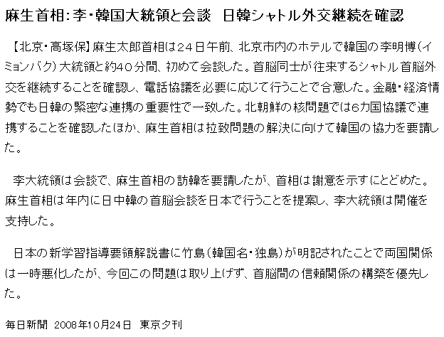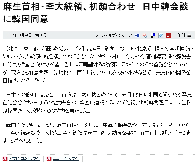 (ところでマダム。どうしてasahi"脱税".comはそんなに麻生首相に訪韓していただきたいのですか?)
