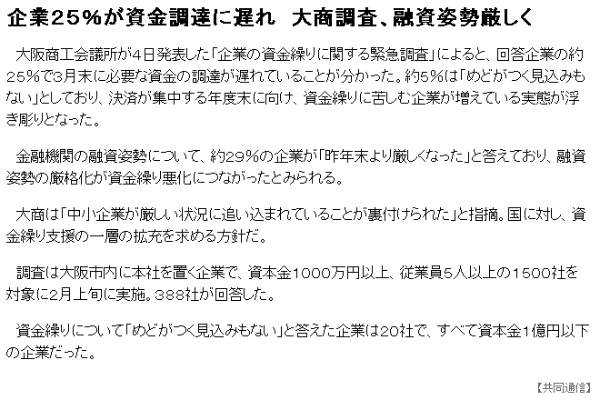企業25%が資金調達に遅れ 大商調査、融資姿勢厳しく(共同通信)