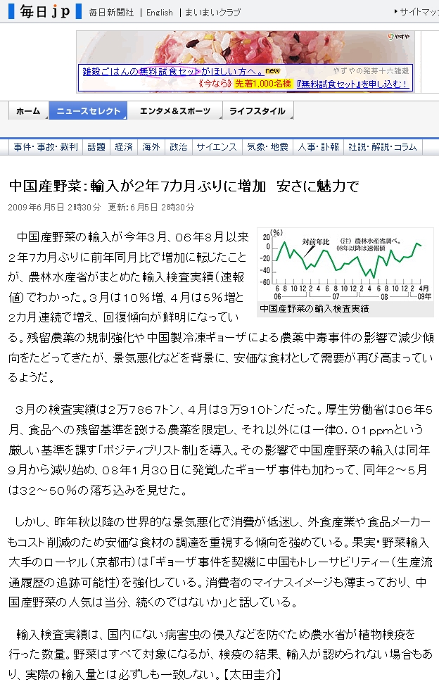 中国産野菜:輸入が2年7ヶ月ぶりに増加 安さに魅力で(毎日"変態".jp)