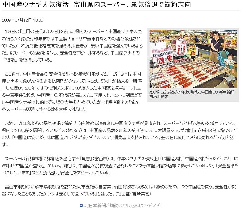 中国産ウナギ人気復活 富山県内スーパー、景気後退で節約志向(北日本新聞)