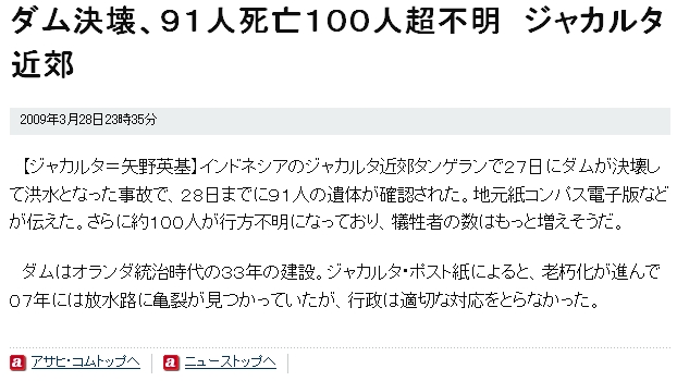 ダム決壊、91人死亡100人超不明 ジャカルタ近郊(asahi"脱税".com)