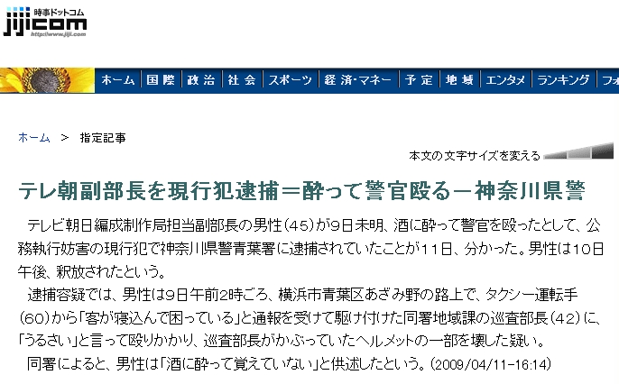 テレ朝副部長を現行犯逮捕=酔って警官殴る-神奈川県警(時事ドットコム)
