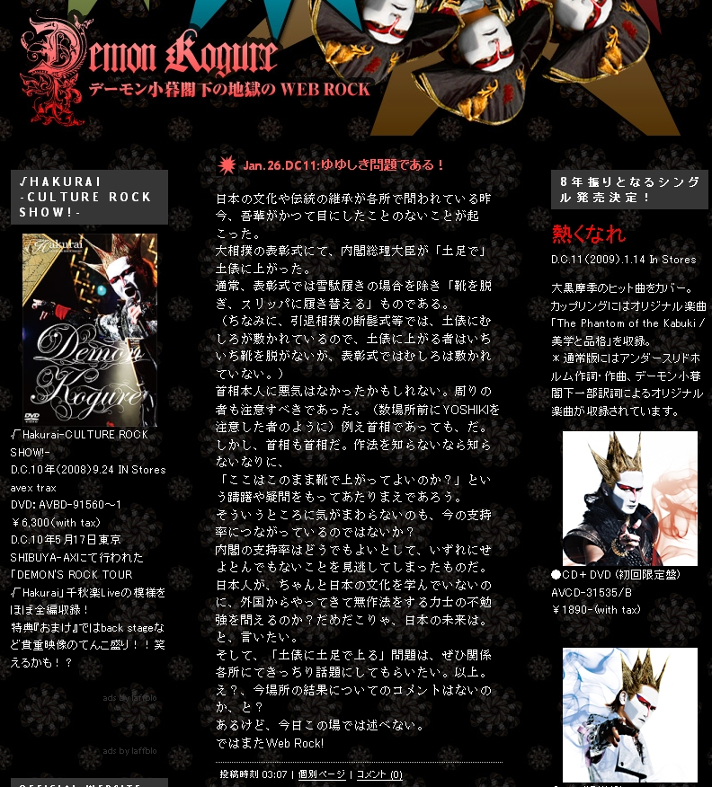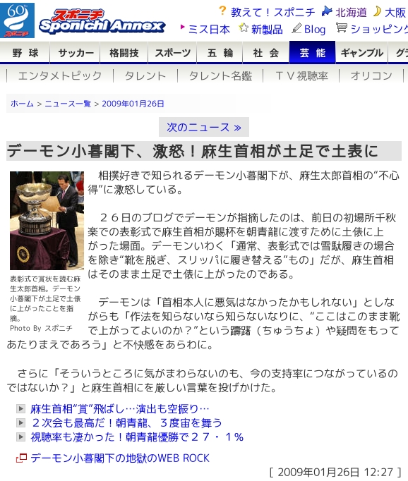 「麻生首相が土足で土俵」批判 デーモン閣下の「勇み足」(J-CASTニュース)