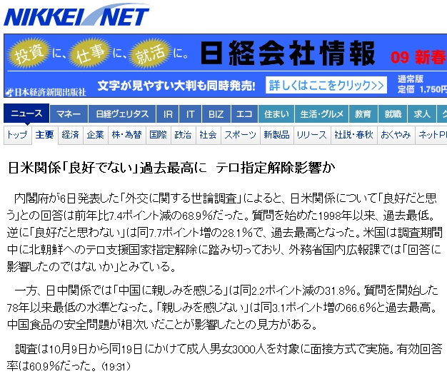 日米関係「良好でない」過去最高に テロ指定解除影響か(NIKKEI NET)
