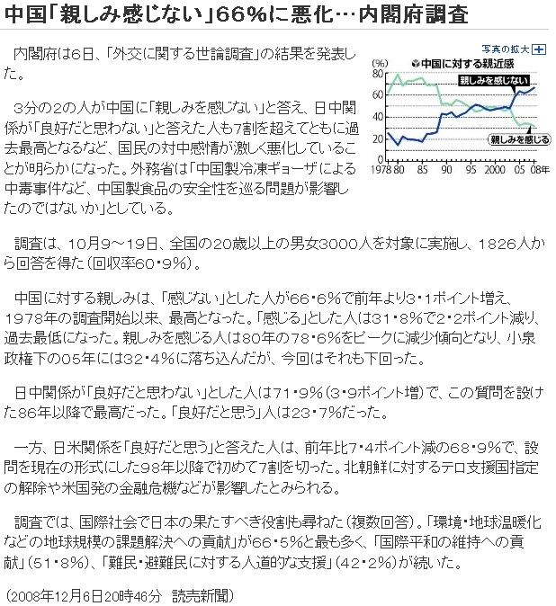 中国「親しみ感じない」66%に悪化…内閣府調査(読売ONLINE)