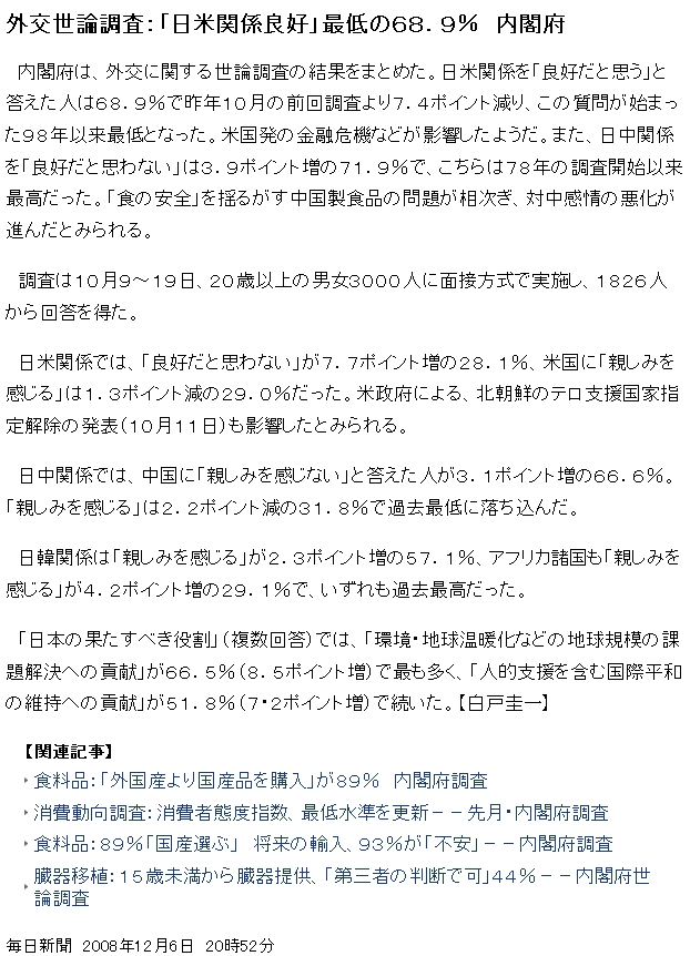 外交世論調査:「日米関係良好」最低の68.9% 内閣府(毎日"変態".jp)