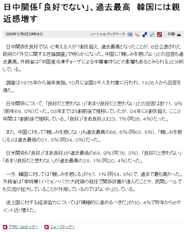 日中関係「良好でない」、過去最高 韓国には親近感増す(asahi"脱税".com)