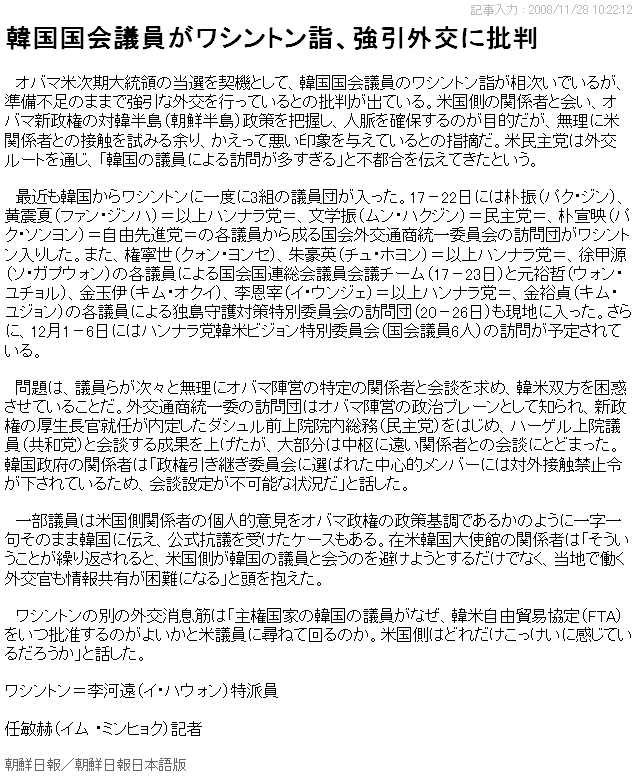 韓国国会議員がワシントン詣、強引外交に批判(朝鮮日報)