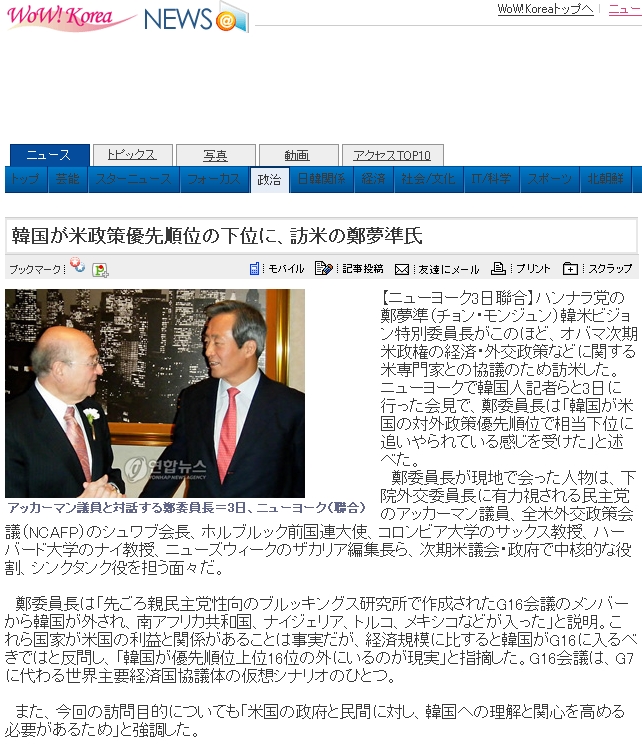 韓国が米政策優先順位の下位に、訪米の鄭夢準氏(韓国新聞)