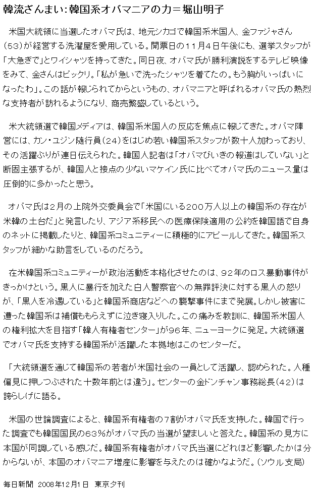 韓流ざんまい:韓国系オバマニアの力=堀山明子(毎日"変態".jp)