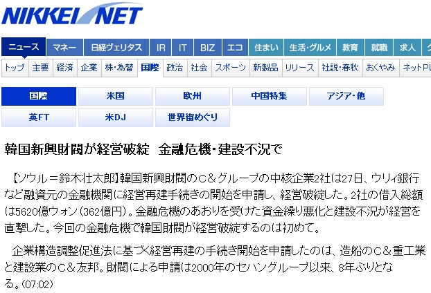 韓国新興財閥が経営破綻 金融危機・建設不況で(NIKKEI NET)